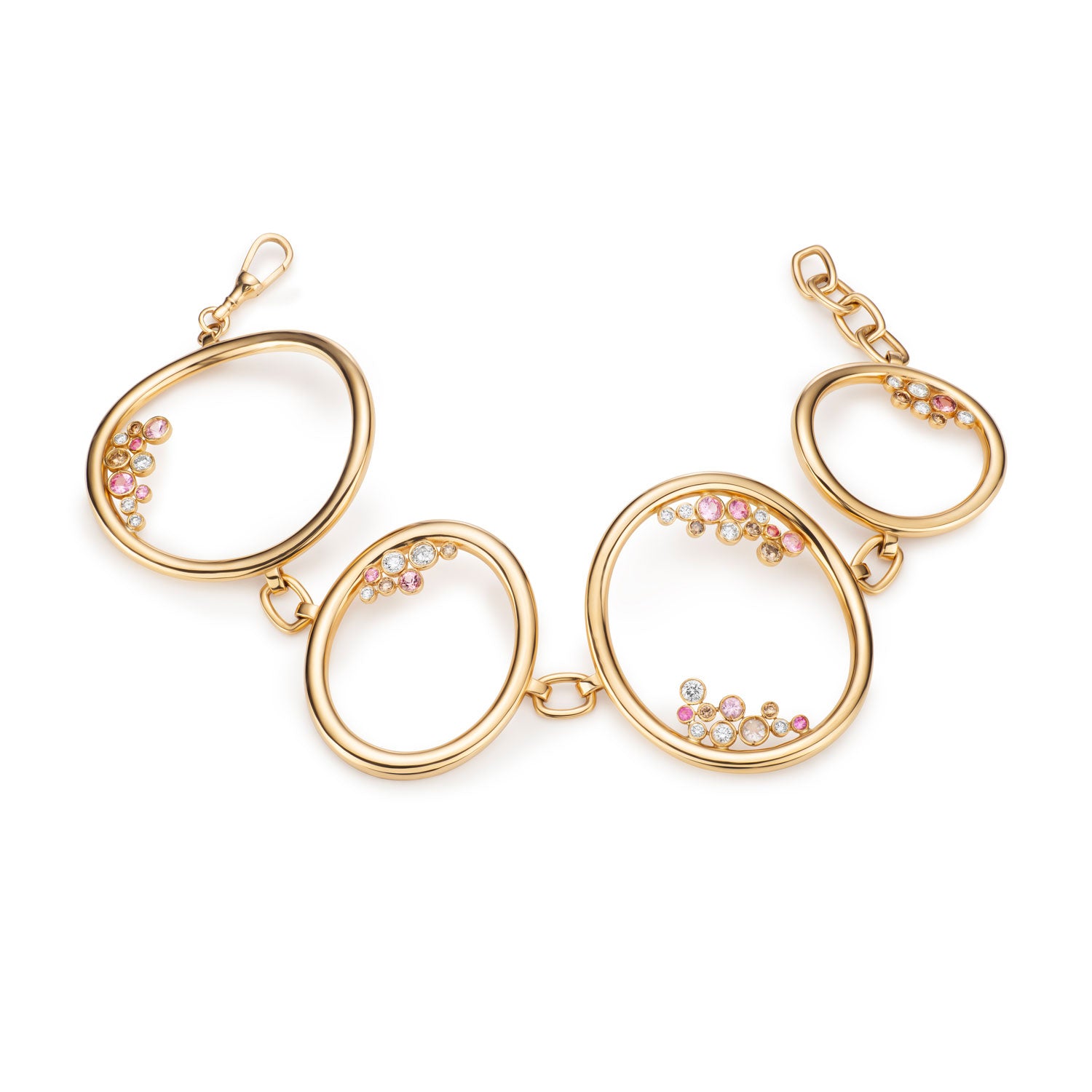Discover Luna Flo London's Golden Pool Bracelet: four interconnected ovals meticulously crafted from 18-carat gold, adorned with diamonds, sapphires, and ruby droplets. Symbolizing unity, harmony, and balance, while evoking energy and fertility with its water imagery. Dive into the elegance of timeless symbolism with Luna Flo London.