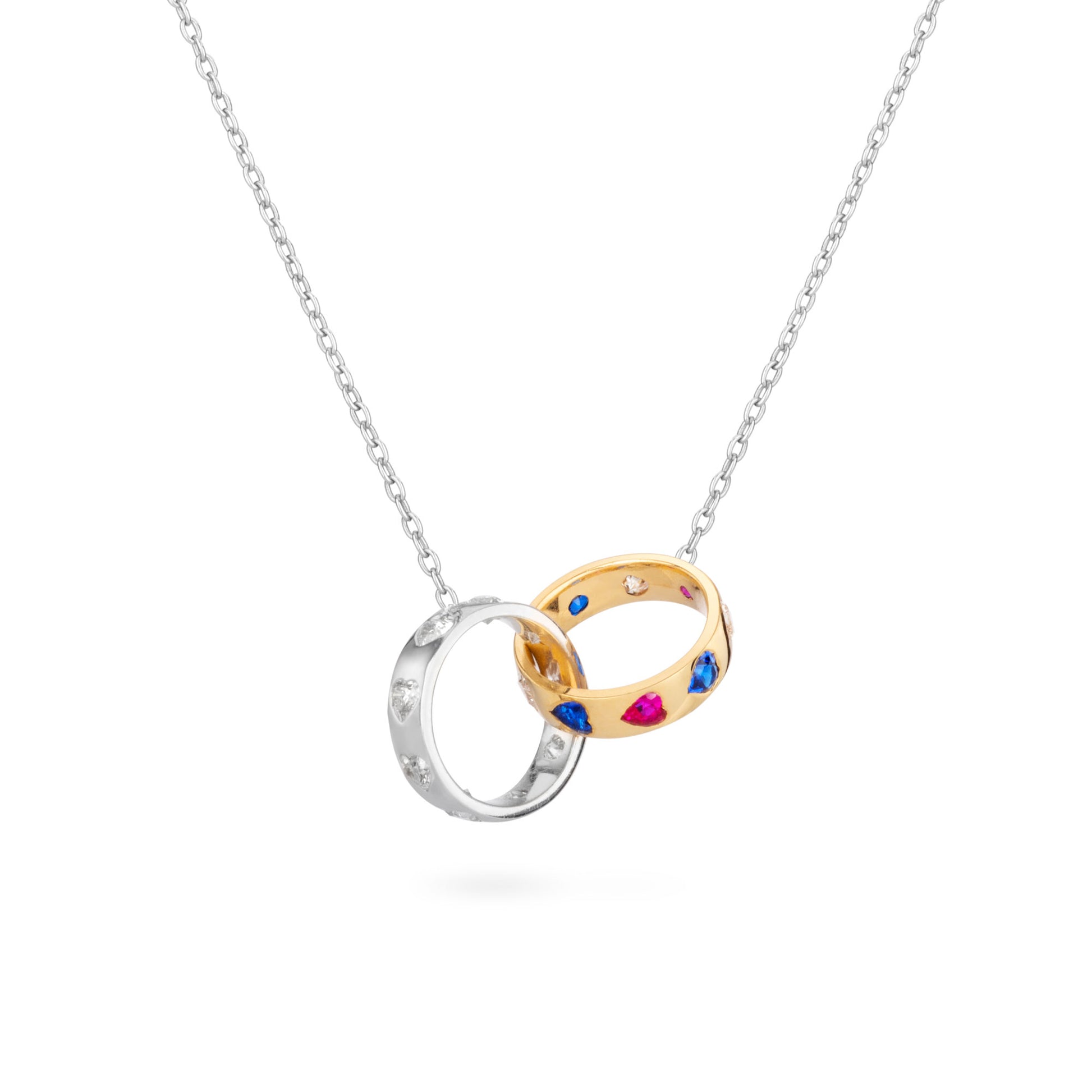 Handcrafted in 18k gold, the Infinite Heart Necklace features two interlocking circles representing infinity. Each loop is inset with small heart-shaped diamonds, sapphires, and rubies, creating a stunning display of color and brilliance. These interlocking circles symbolize the endless nature of love and connection, a perfect harmony of unity and passion. Soon to be featured in a major motion picture, this necklace embodies the timeless elegance and enduring relationships we hold dear. When we wear this piece, we carry with us a reminder of our infinite capacity to love and be loved, letting our hearts soar freely with every beat.